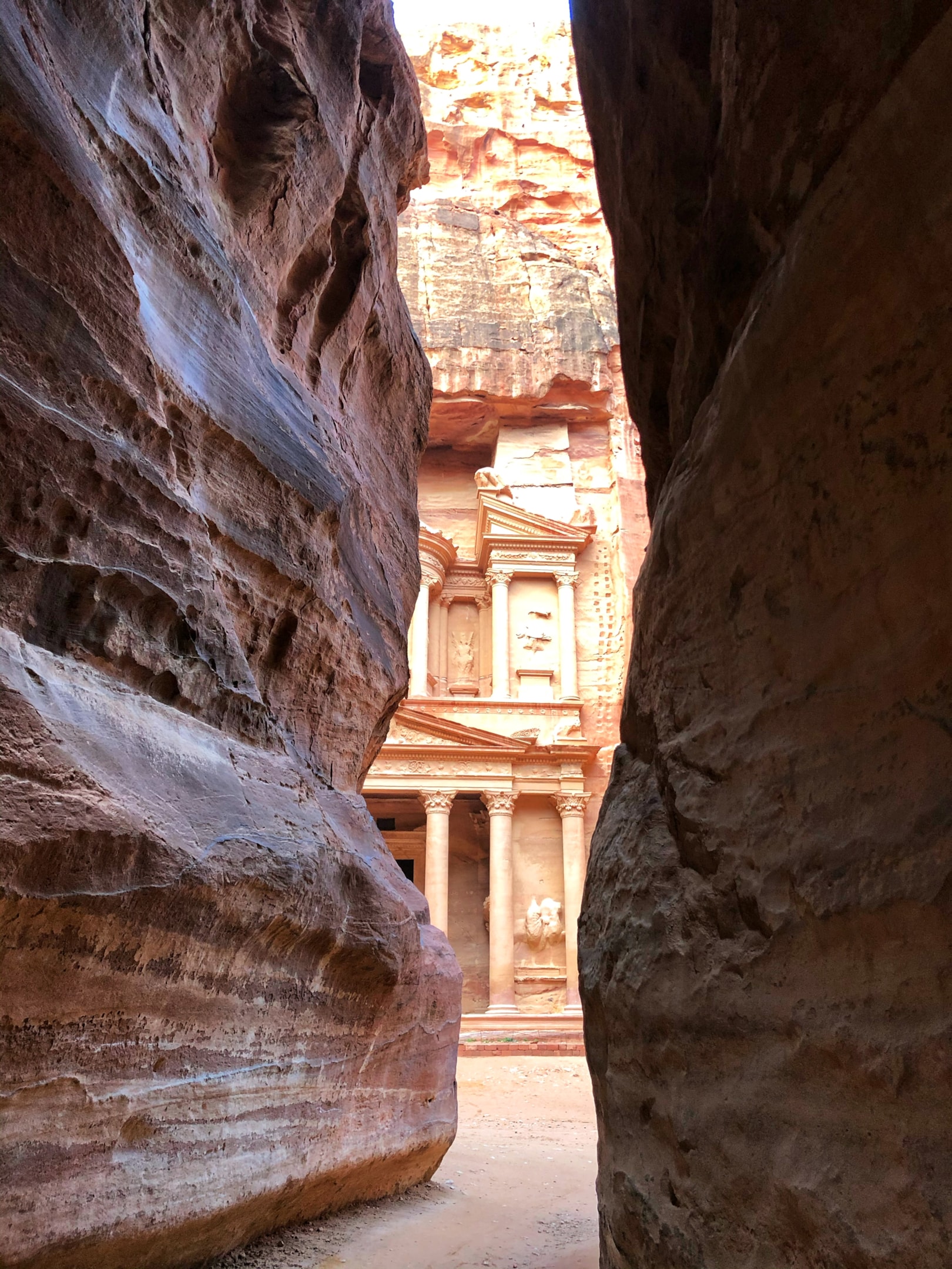 The journey into Petra begins with a 20 minute (1.3 mile) walk through the Siq, a narrow and winding path between towering rock walls. As you approach the end of the Siq, the rock walls will begin to unveil the incredible first view of the Treasury.